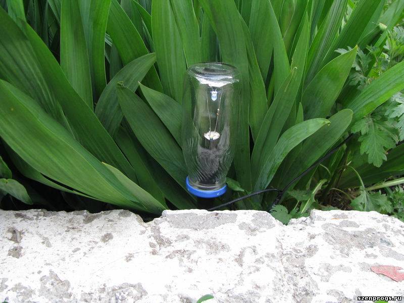 Остается только надеть на палку плафон (сама банка или бутылка) и завернуть ее на крышке. Не забудьте хорошо высушить бутылку, иначе в самодельном садовом фонаре может возникнуть конденсат.