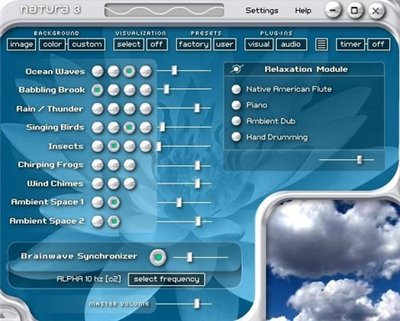 Эта программа предназначена для создания приятного звукового фона при работе за компьютером. Natura Sound Therapy - поможет вам отвлечься или сосредоточится на работе, а также хорошенько расслабиться под 34 натуральных звука: пения птиц, стрекотание насекомых, кваканий лягушки, завывание ветра, игре на флейте или фортепиано, шум и накат океанских волн, шума леса, шторма и т. д.